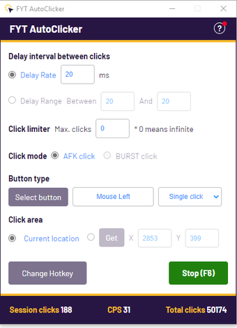 Забудьте о повторных кликах и нажатиях клавиш снова и снова; с FYT Auto Clicker вы можете настроить свою клавиатуру и мышь по своему усмотрению, включая настройку задержки между кликами и использование случайных задержек. Идеальная программа, чтобы ваши рабочие часы (или игра) были намного легче.